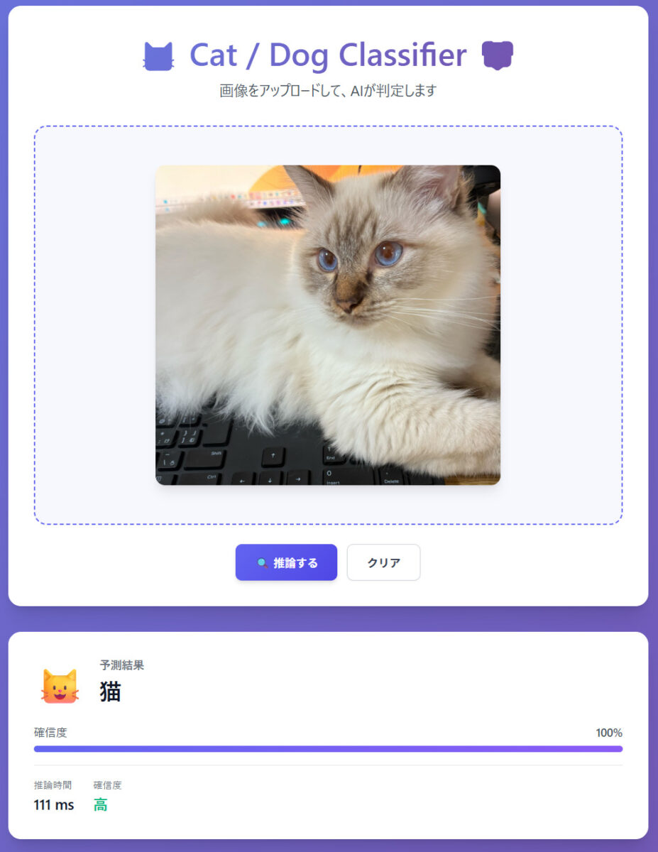 犬と猫の画像をアップロードすると、AIがどちらかを判定して確信度を表示するシンプルな Web アプリです。