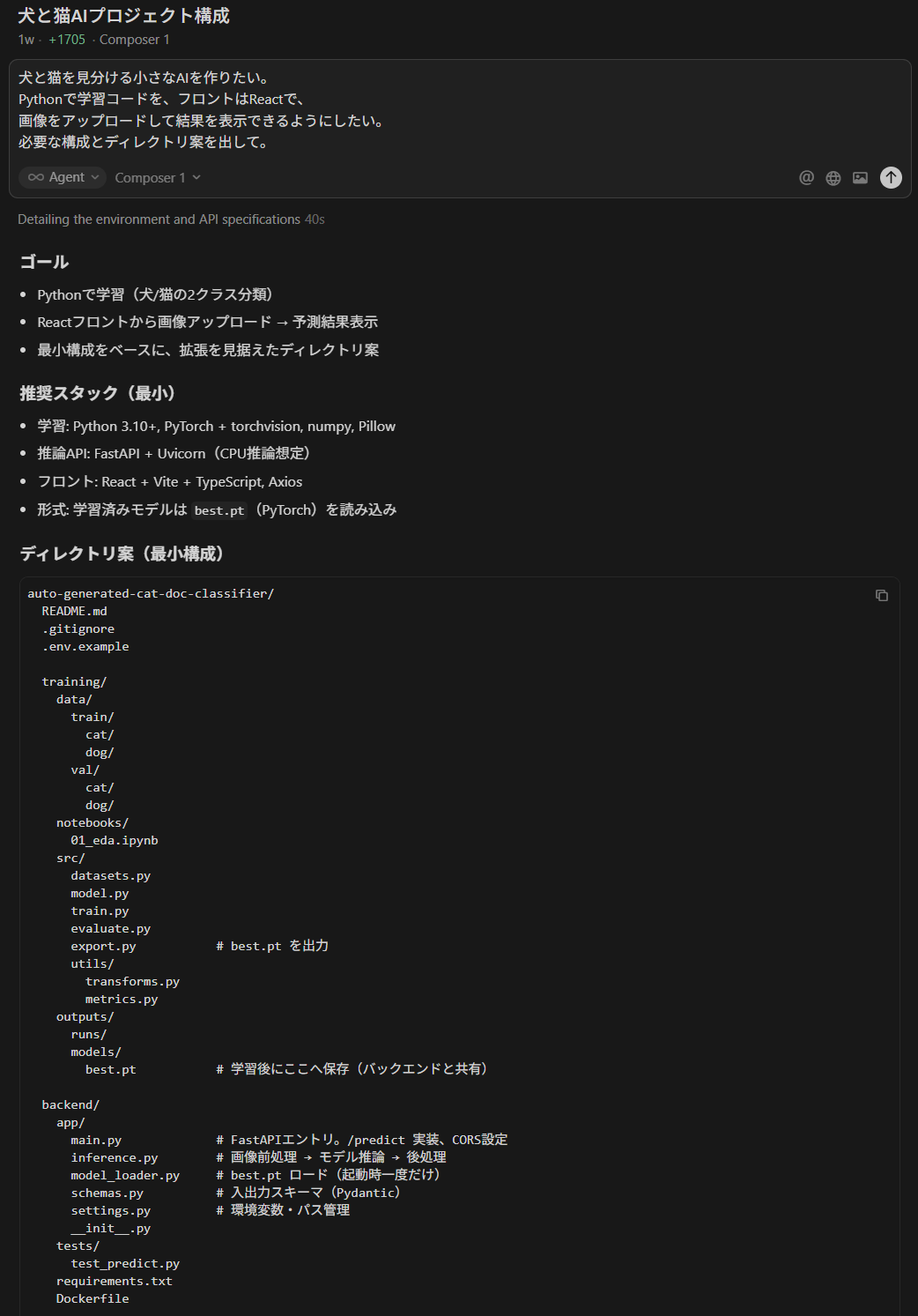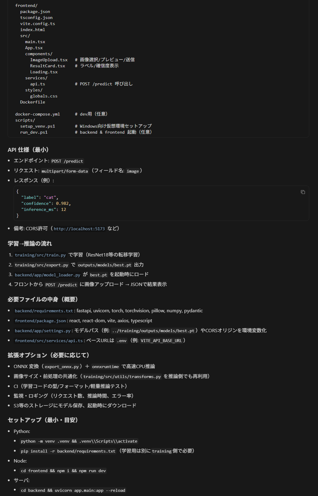 → 3層(学習/API/フロント)の最小セットを一気に生成