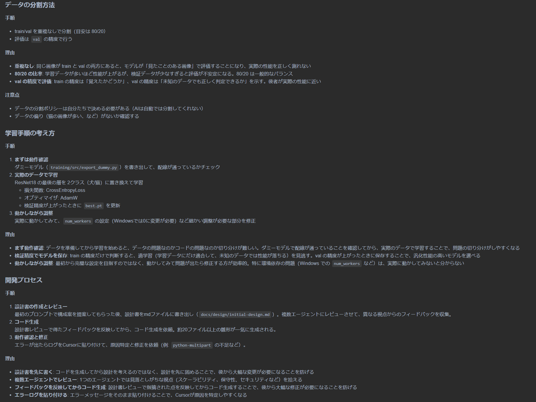 「小さく作って速く回す」サイクルを加速させるために Cursor を使いました。コードを書く時間、エラーを解決する時間を短縮し、試行錯誤のサイクルを速く回す。そのために Cursor に任せられる部分は任せ、判断が必要な部分(データの分割方法、設計の線引き、エージェントの提案の取捨選択など)は自分で決めました。